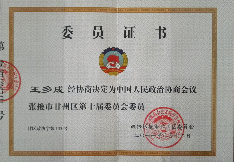 2010年榮獲入選為甘肅省領(lǐng)軍人才第一層次人員證書