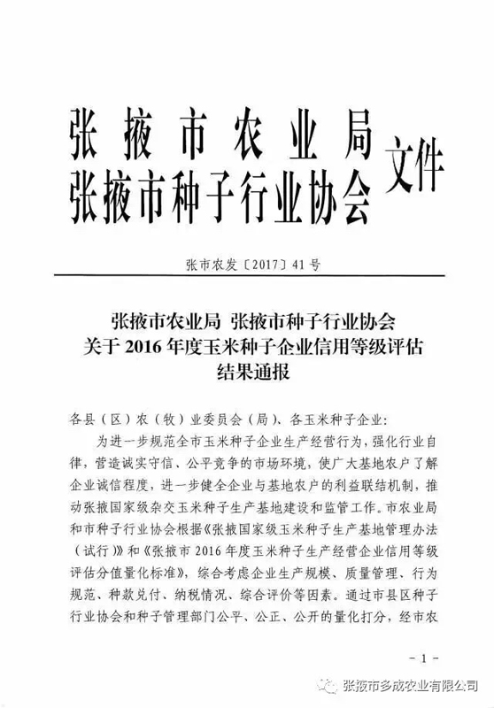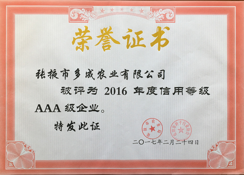 2017年2月24日,張掖市農(nóng)業(yè)局、張掖市種子行業(yè)協(xié)會(huì)公布的《2016年度玉米種子企業(yè)信用等級(jí)評(píng)估結(jié)果》中,張掖市多成農(nóng)業(yè)有限公司被評(píng)為2016年度信用等級(jí)AAA級(jí)企業(yè)。